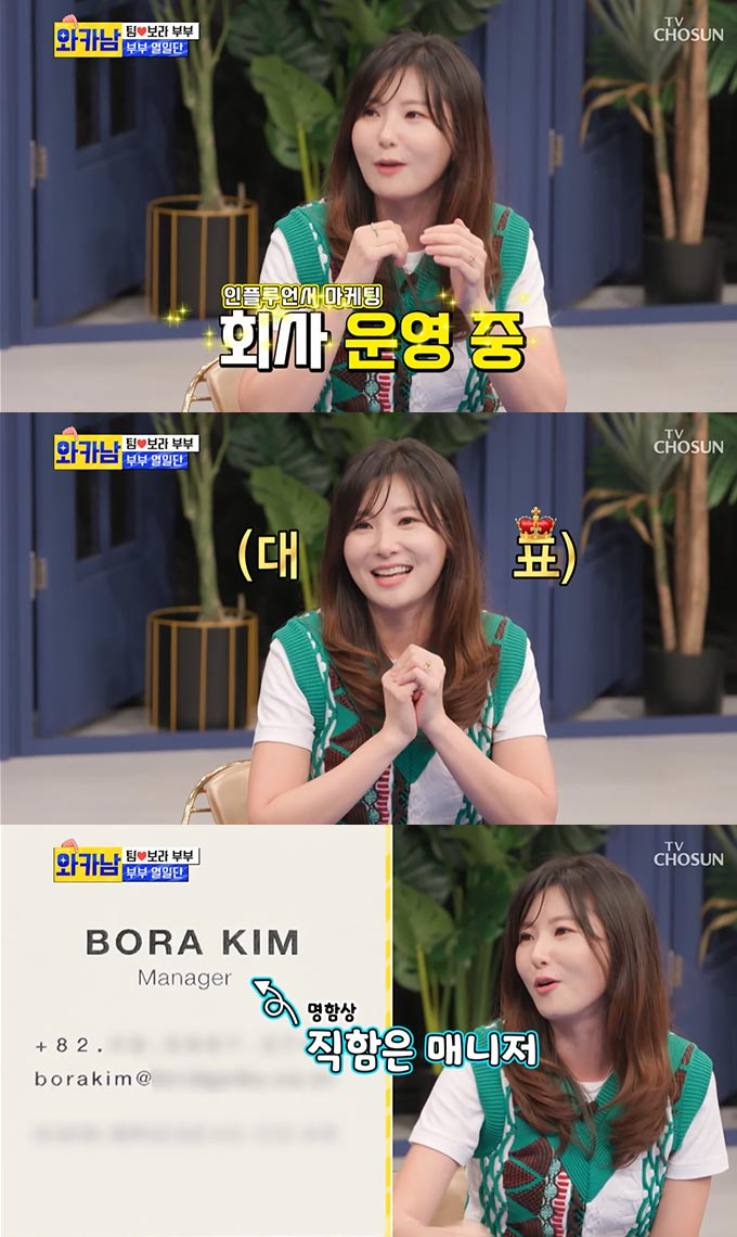 이휘재가 "보라 씨는 명함에 뭐라고 적혀 있냐"고 묻자 김보라는 "제가 대표라는 단어가 너무 오글거려서 명함에는 영어로 '매니저'라고 써 있다"고 답했다.