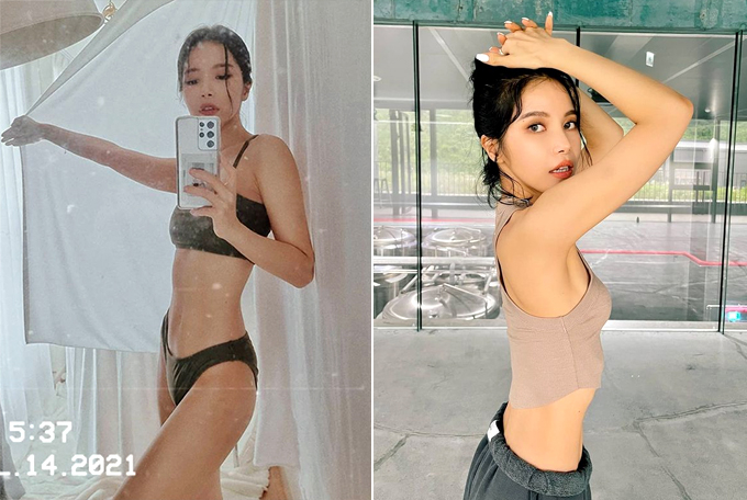 사진 속 솔라는 검정색 비키니를 입고 거울 셀카를 찍고 있다. 한 손에 잡힐 듯 잘록한 허리와 선명한 11자 복근이 시선을 사로잡는다.