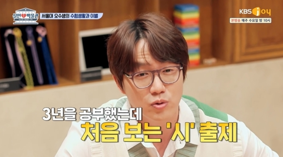 이어 "모르는 시 3개가 엮여서 그것과 관련된 문제가 11개나 나왔더라. 시험지에 소나기가 내려서 정신을 잃었다"며 "3년 공부했는데도 그런 똥같은 일이 생긴다"고 말했다.