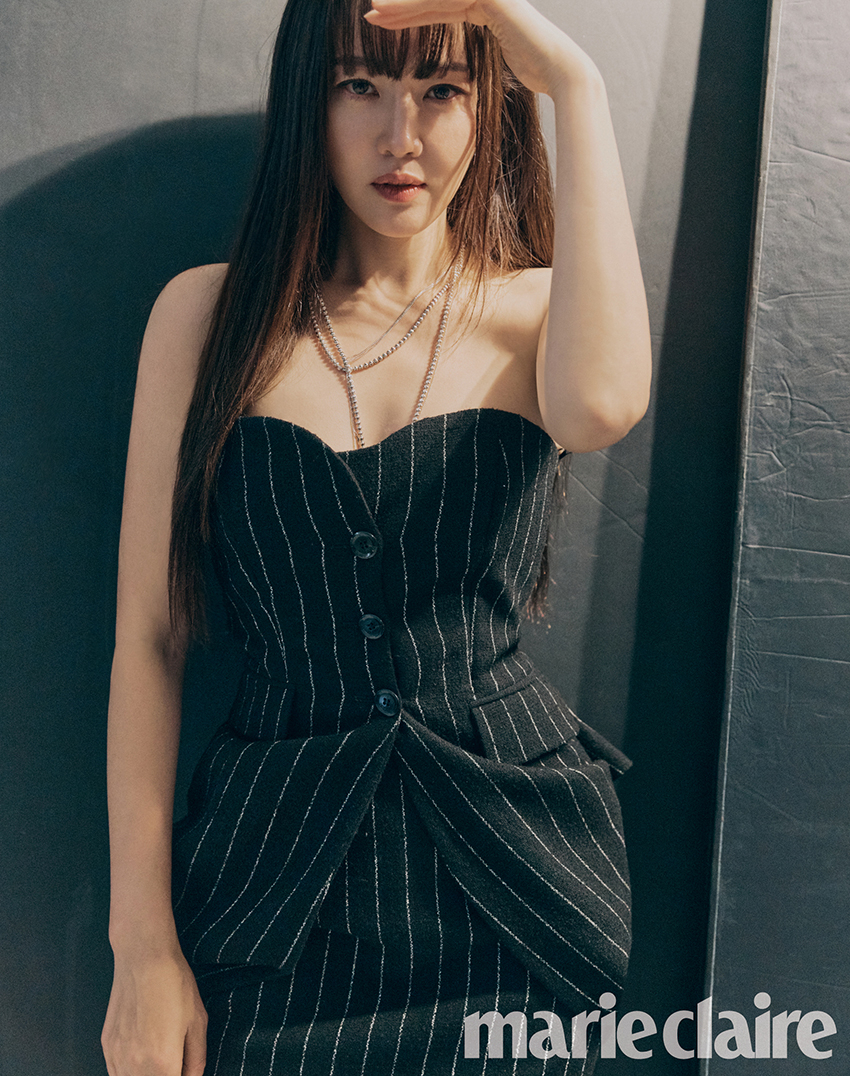 공개된 화보 속 엄지원은 세련된 핀 스트라이프가 돋보이는 코르셋 뷔스티에에 스커트를 맞춰 입고, 반짝이는 보석 체인 목걸이를 겹겹이 매치해 럭셔리한 포인트를 더했다.