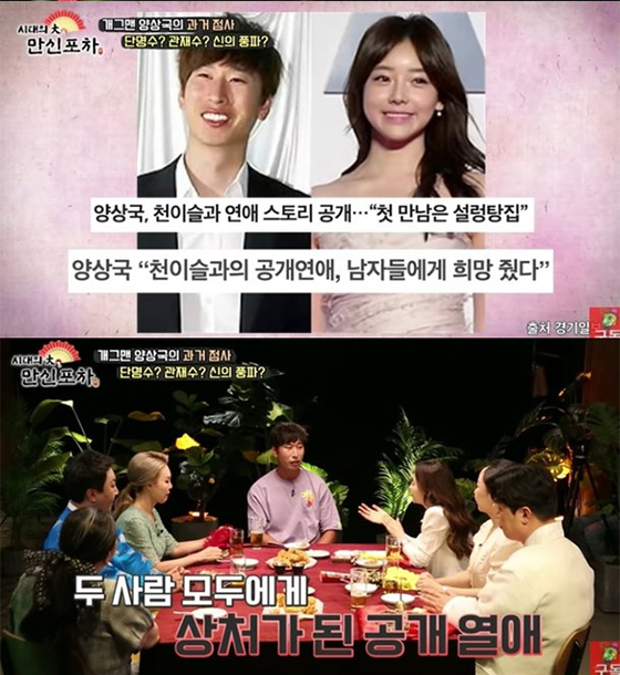 이날 양상국은 "여자에 대한 구설수가 있고 내 마음을 잘 표현하지 않는 스타일이다"라고 말하는 만신의 점사를 듣고 "놀랄 일은 아닌데 전 국민이 아는 사건이 있다"며 과거 천이슬과의 공개열애를 언급했다.