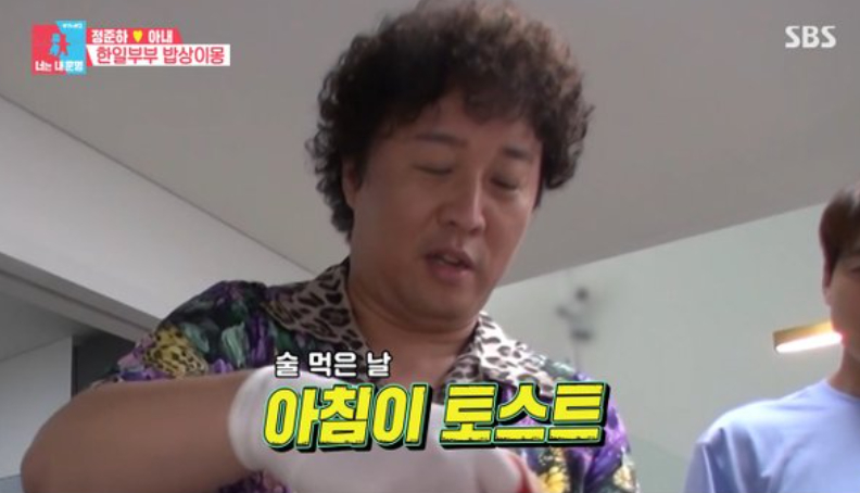 아야네가 "주로 한식을 하시냐, 일식을 하시냐"고 묻자 정준하는 "지금은 둘 다 한다"고 밝혔다. 이어 "사실 결혼 초엔 당황했다. 아내가 아침을 아메리칸 스타일로 토스트를 해주더라. 술 먹은 다음날 아침이 토스트였다"며 "사실 힘들었는데 '난 원래 아침으로 토스트를 먹는다'고 했다"고 말했다.