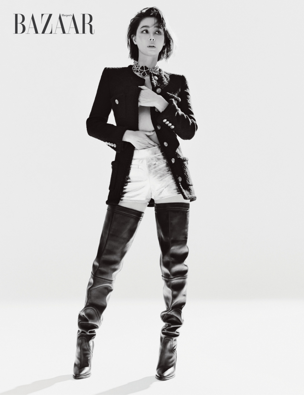 화보 속 김성령은 속옷을 탈의하고 맨몸에 재킷을 걸친 채 아찔한 핫팬츠 룩을 연출했다. 그는 손으로 가슴을 가린 포즈와 싸이하이부츠 스타일링으로 과감한 룩을 완성했다.