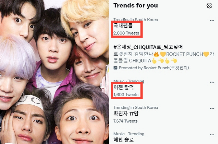 23일 오후 2시 기준 트위터에는 실시간 트렌드로 '국내 팬들', '이젠 탈덕'이라는 키워드가 올라왔다. BTS와 하이브를 겨냥한 두 키워드는 이날만 트위터에서 수천 번 언급되며 논란을 키우고 있다.