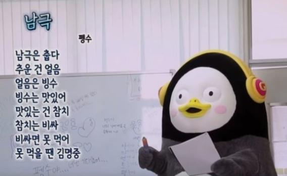 최근 올라온 유튜브 채널 '자이언트 펭TV' 쇼츠 영상엔, 펭수가 김 사장의 퇴임식에 리본을 달고 참석한 모습이 담겼다. 리본에는 '가지마 김명중'이라고 세로로 쓰여 있었다.