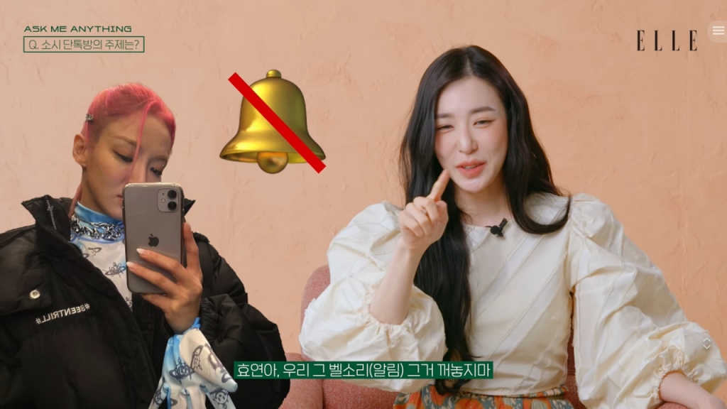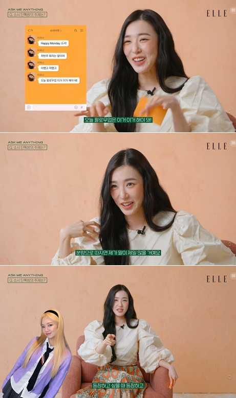 티파니는 '요즘 소녀시대 단톡방의 주제는 뭐냐'는 질문에 "최근 태연 생일이어서 단톡방이 축제 분위기였다"며 "요즘에는 서로 퀴즈를 보낸다. 자신이 무슨 색상인지 어떤 꽃인지, 동물인지. 항상 서로 좀 더 알아갔으면 하는 마음"이라고 멤버들을 향한 애정을 드러냈다.