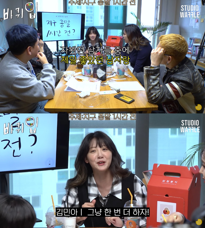 지구 종말 1시간 전에 무슨 일을 할 것이냐는 질문에 김민아는 "지금까지 자봤던 남자들 중 제일 좋았던 남자랑…마지막으로 어차피 죽는데 그냥 한 번 더 하자"라고 외쳐 주변을 웃음바다로 만들었다.