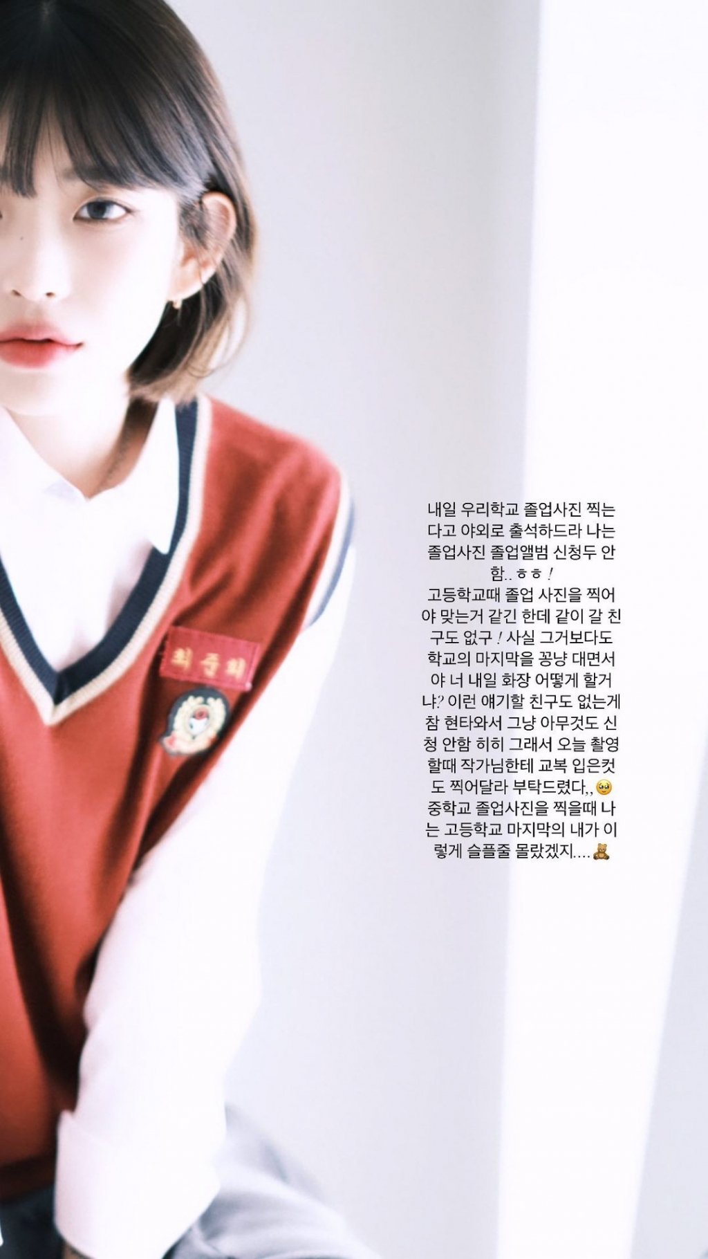 이어 "그래서 오늘 촬영할 때 작가님한테 교복 입은 컷도 찍어달라 부탁드렸다"며 "중학교 졸업사진을 찍을 때 나는 고등학교 마지막의 내가 이렇게 슬플 줄 몰랐겠지"라고 덧붙였다.