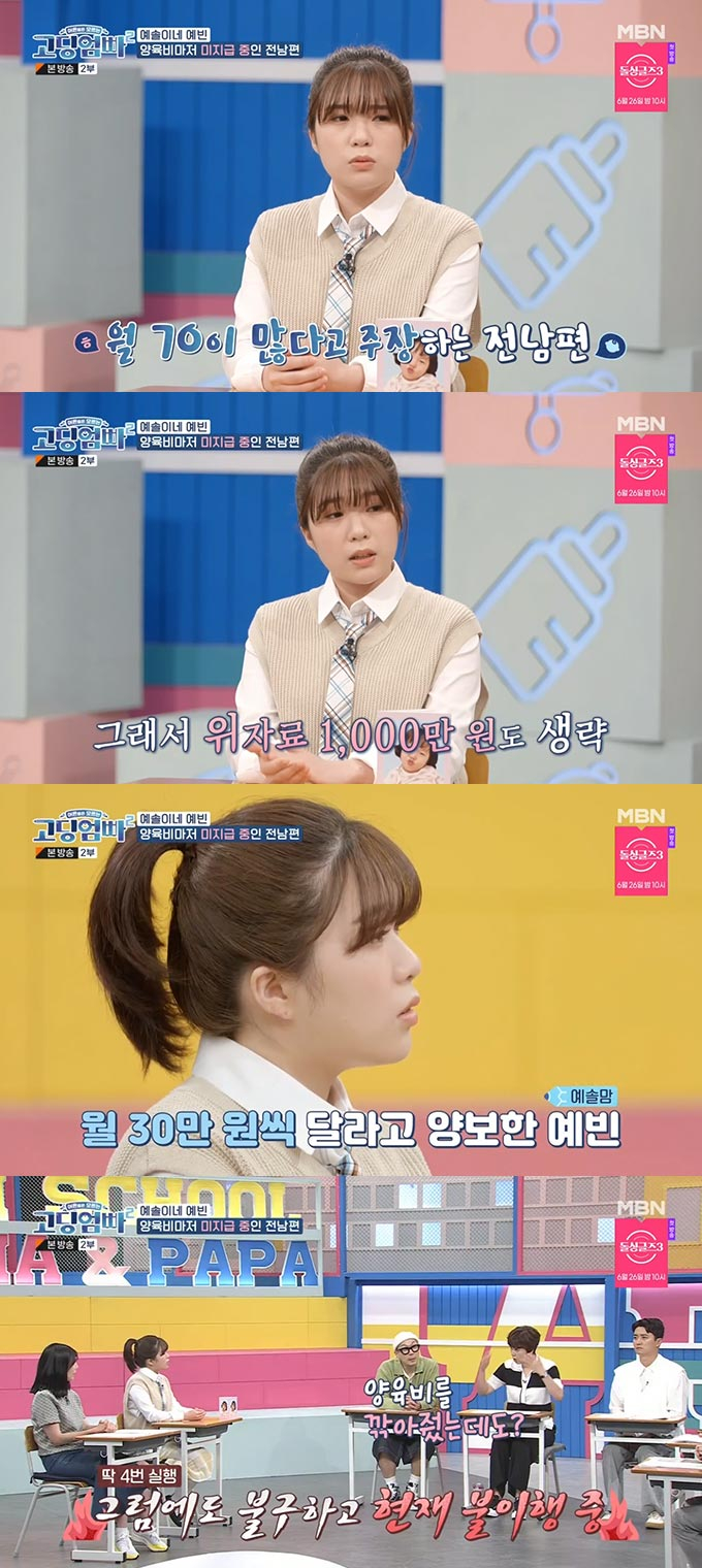 김예빈은 "이혼 재판 때 매달 전 남편이 매달 70만 원씩 양육비를 지급하는 것으로 판결이 났다. 그런데 처음 네 달만 30만원씩 주고는 안 준다. 내가 법으로도 어떻게 못한다"고 토로했다.