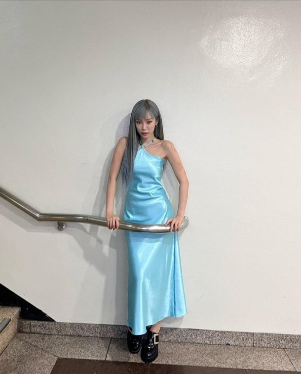 공개된 사진 속 헤이즈는 하늘색 홀터넥(halter neck) 드레스를 입고 카메라를 바라보고 있다. 특히 그는 좁은 계단 난간 사이에 몸을 집어넣고 포즈를 취해 늘씬한 몸매를 돋보이게 했다.