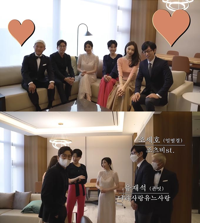 유재석, 조세호, 이적, 장도연은 신부대기실에 있는 이해리와 강민경과 함께 기념 사진을 남기기도 했다.
