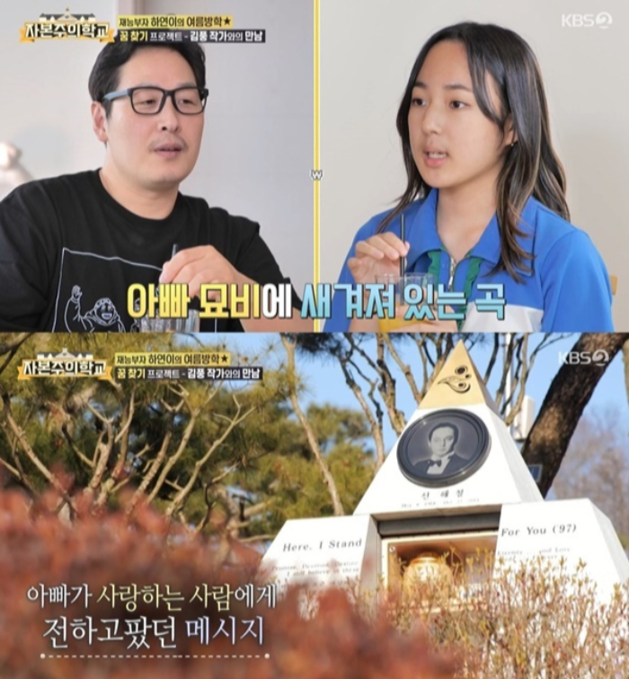 하연양은 '평소 노래방에서 아버지 노래를 많이 부르냐'는 질문에 "초등학생 때부터 불렀다. 아빠 노래 중 'Here, I Stand for you'라는 노래를 좋아한다. 그 곡이 의미가 있는 게 아빠 묘비에 새겨져 있다"고 답했다.