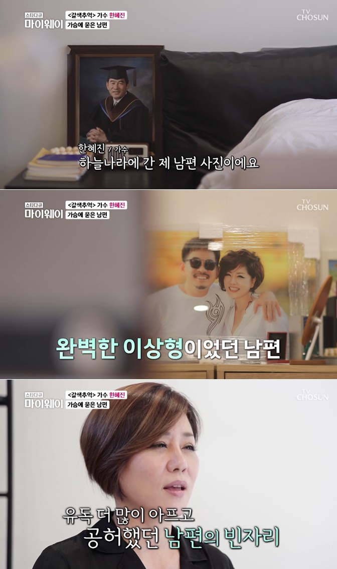 가수 한혜진(57)이 1년 전 세상을 떠난 남편을 떠올리며 눈물을 흘렸다.
