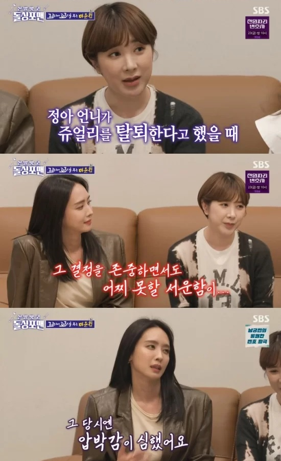 이어 서인영은 박정아에게 "언니가 쥬얼리 탈퇴한다고 했을 때 진짜로 많이 서운했다"며 "당시 언니 의견을 존중해야 한다고 생각하면서도 되게 서운했다"고 밝혔다.