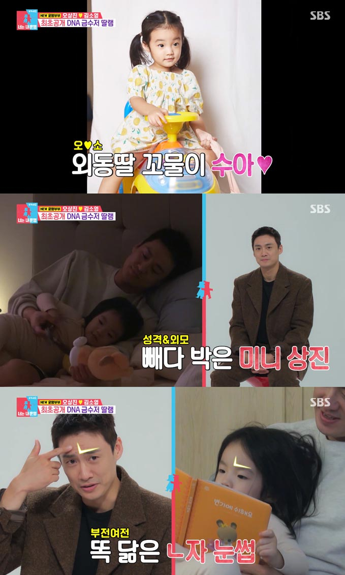 오상진은 "인상 쓰면 'ㄴ'(니은)자 눈썹이 있는데 그게 똑같다"고 말했고, 책을 읽는 딸 수아의 눈썹 역시 니은으로 바뀌는 모습이 공개됐다. 이지혜는 "그러네"라며 "그러면 아빠랑 있는 시간이 많은 것"이라고 말했다.