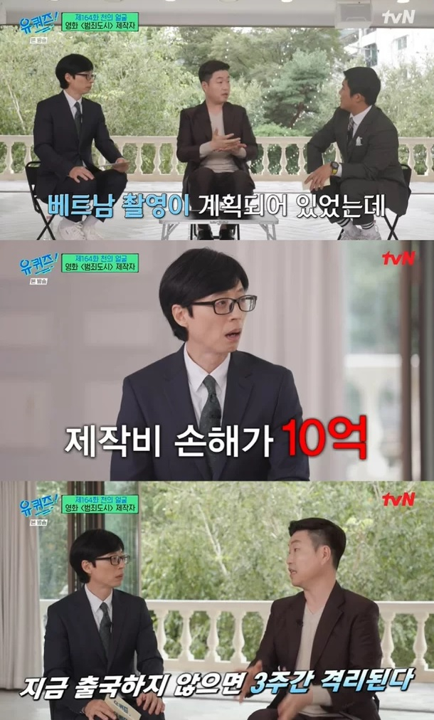 이어 장 대표는 코로나19 탓에 약 10억원의 제작비 손해를 봤던 경험을 털어놨다. 그는 "(범죄도시 2의) 베트남 촬영이 계획돼 있었는데 코로나19 때문에 추방을 당한 적이 있다"며 "당장 출국하지 않으면 3주 동안 격리된다고 하더라. 제작비 10억원 정도 손해 보고 떠났다"고 밝혔다.