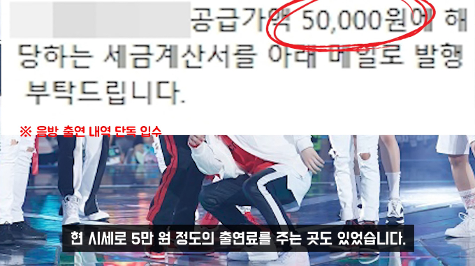 그는 "대한민국 대표하는 TOP3 팀이 아닌 이상 50만원 이상의 출연료를 받지 못한다"며 "초대형 울트라급 인기 스타가 50만원(최대 100만원)대라고 보면 된다. 일반적인 아이돌들은 단돈 10만원이었다"고 했다.