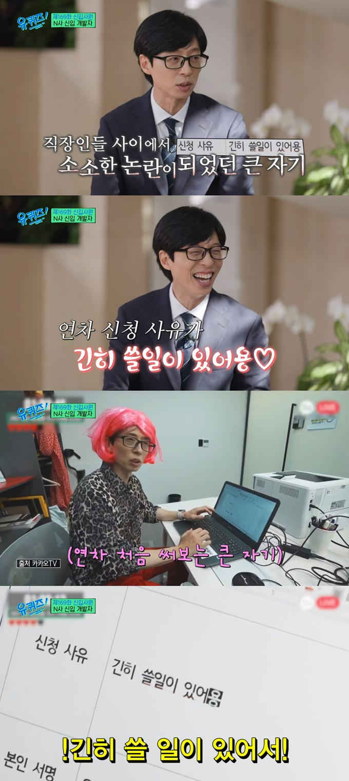 당시 유재석은 "연차 신청 사유를 뭐라 써야 하냐"며 망설이고는 '긴히 쓸 일이 있어용'이라고 적은 바 있다.