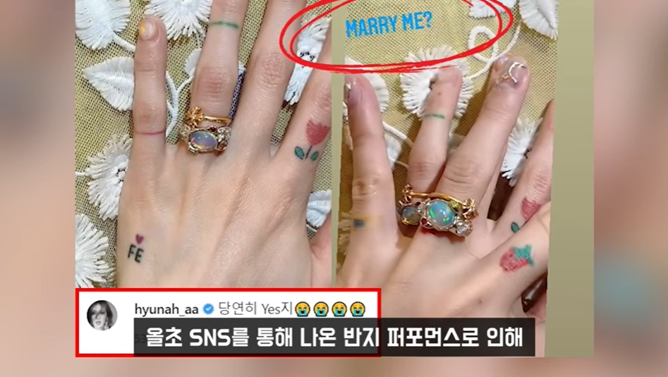 던은 지난 7월 SNS(소셜네트워크서비스)에 현아와 맞춘 반지 사진과 함께 'Marry me?'라는 글을 올렸다. 현아도 같은 사진을 공유하고 "당연히 yes지"라고 답해 결혼설이 불거졌다.