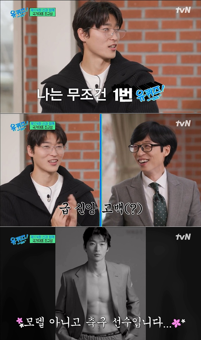 조규성은 "월드컵 끝나고 방송 섭외가 몇 군데에서 들어왔다. 저는 무조건 첫 번째가 '유퀴즈'라고 했다. 자주 챙겨 보는 프로그램이고, 유재석 님을 신으로 생각한다. 너무 팬이다. 제가 영광이다"라고 출연 소감을 밝혔다.