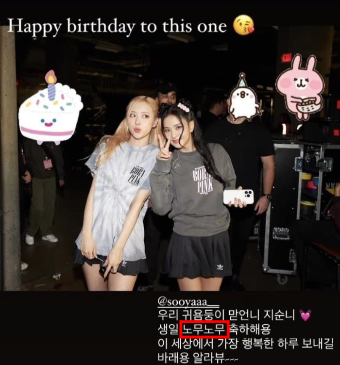 다만 사진에 첨부한 글이 논란을 불렀다. 로제는 "우리 귀염둥이 맏언니 '지순니'(지수 언니) 생일 노무노무 축하한다. 이 세상에서 가장 행복한 하루 보내길 바라요. 알라뷰"라고 적었는데, '노무노무'가 혐오 표현으로 간주되는 표현이기 때문이다.
