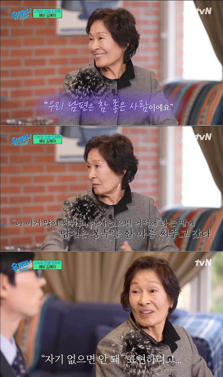김혜자는 1998년 췌장암으로 세상을 떠난 사업가 남편도 떠올렸다. 그는 "남편은 정말 좋은 사람이다. 투병 중에도 '내가 없으면 아무것도 못 하는데 어떡하냐'고 하면서 날 걱정했다"고 말하며 눈물을 보였다.