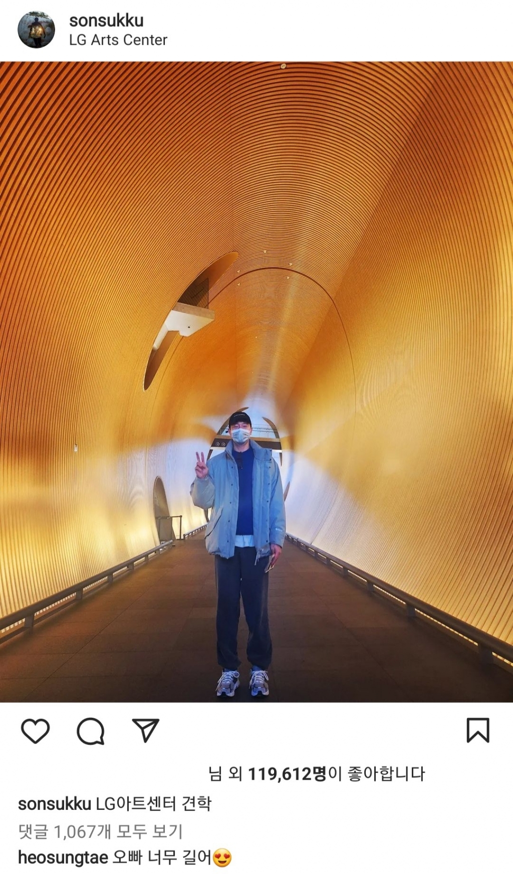 게시글에 배우 허성태는 "오빠 너무 길어"라고 쓰며 하트 눈의 이모티콘을 댓글로 남겨 네티즌의 웃음을 자아냈다.