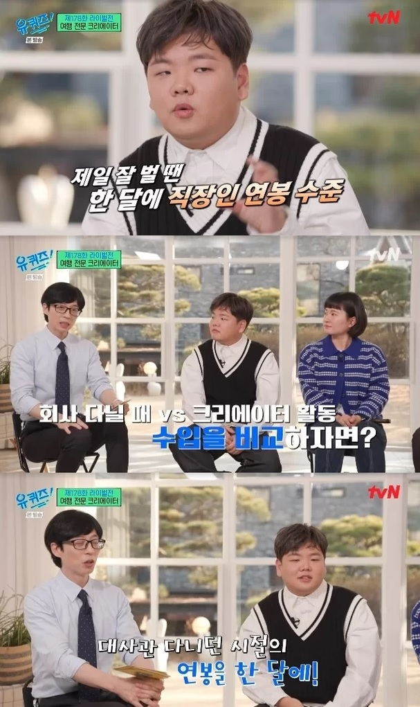 그러면서 "여행 유튜버로 전향한 뒤 제일 많이 돈을 벌었을 땐 한 달 기준으로 직장인 연봉을 벌었다"며 "대사관 다닐 때의 연봉을 유튜브 하면서 한 달 만에 번 적이 있다"고 했다.