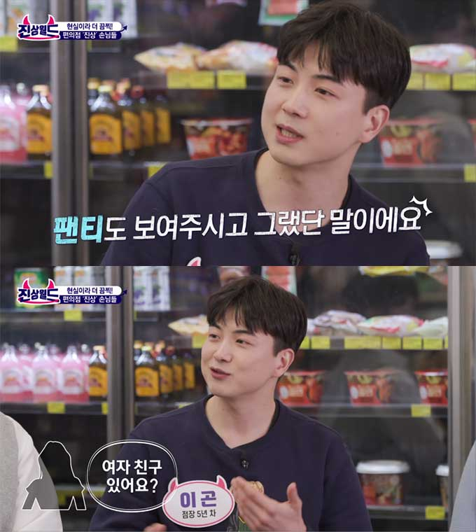 점장은 "손님이 '(잘 생겼는데) 왜 편의점에서 일하냐'고 하더라. 여자친구 있냐고 해서 (거짓말로) 결혼도 했다고 했다"며 "그랬더니 치마를 입고 계셨는데, 바닥에 앉아서 팬티를 막 보여주더라. 다른 손님들이 왔다 갔다 하는데도 아랑곳하지 않았다"고 당시 상황을 설명했다.
