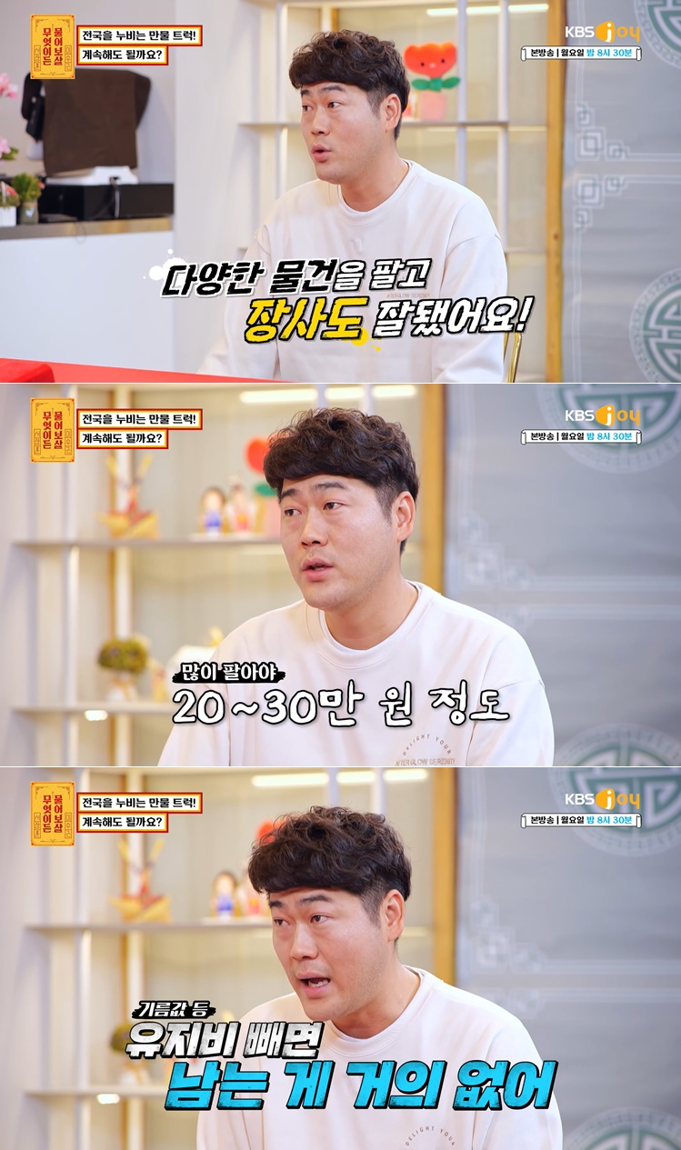 그는 "10년 전만 해도 만물 트럭이 전국에 300~500대 정도 있었다. 지금은 30대 정도 남은 것 같다"며 "3대가 전국을 누비며 물건을 팔고 장사도 잘됐다. 전성기 최고 매출은 하루 100만원이었다. 요즘은 하루 20~30만원 정도 번다. 기름값 등 빼면 남는 게 없다"고 토로했다.