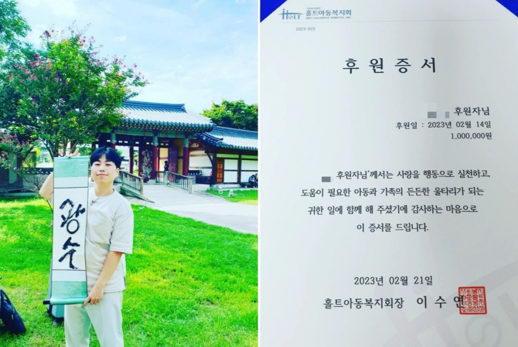 그는 후원증서 사진을 공개하며 "다음 세대 아이들이 가족의 사랑을 받고 행복하게 자라나길 바라는 마음이 잘 전달되길 바란다"고 적었다. 후원증서를 보면 광수는 홀트아동복지회에 100만원을 후원했다.