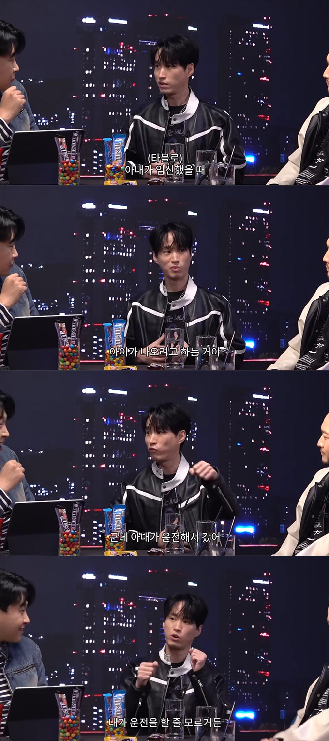 그는 "아내가 임신했을 때 아이가 나오려고 했다. 그래서 병원에 가야 했다. 내가 차에 같이 있었는데 아내가 운전해서 갔다. 나는 옆에 앉아서 '괜찮아? 괜찮아?' 이러고, (강혜정은) '괜찮아'라고 했다. 그렇게 스스로 운전해서 병원에 갔고 아이를 출산했다. 내가 운전을 할 수 없어서 그랬다"고 말했다.