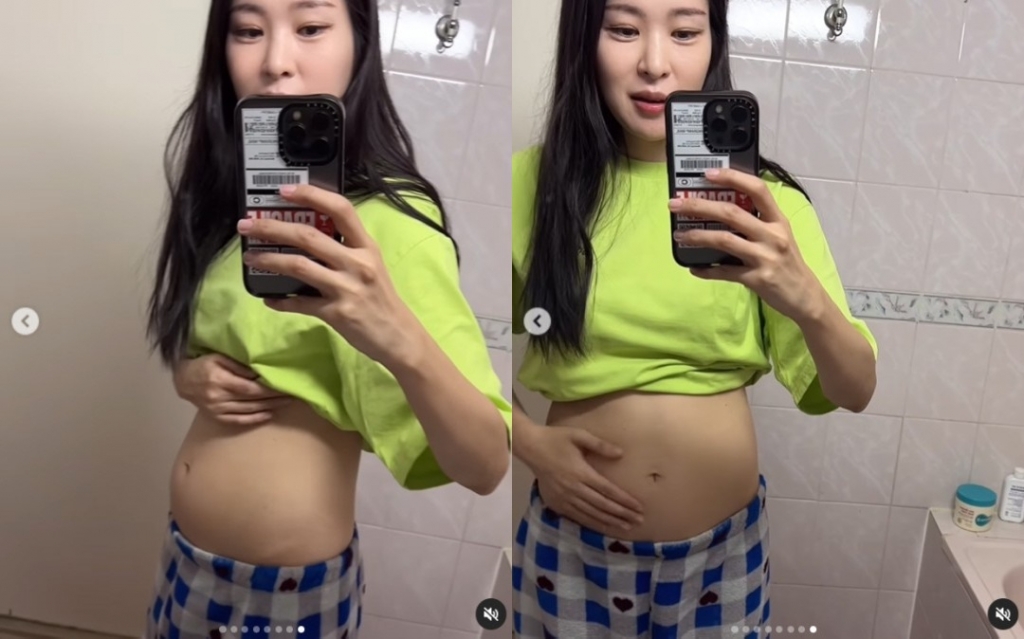 친정에 들렀다가 어머니가 차려준 족발을 먹은 미자는 "맛있게 먹고 세상 편하게 누워서 '더 글로리' 보고 있는데 남편이 찍어준 사진 속에 빼꼼 마중 나온 배를 보고 깜놀"이라며 티셔츠 아래 봉긋한 배를 인증했다.