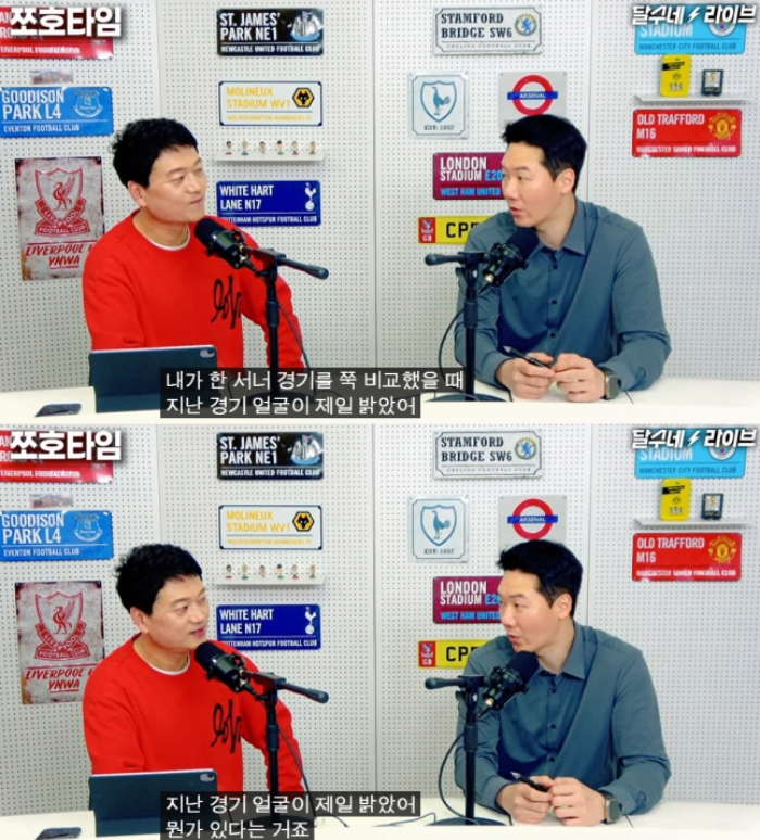 김동완은 "손흥민의 서너 경기를 쭉 비교해 봤을 때 지난 경기에서 얼굴이 제일 밝았다. 뭔가 있다는 것"이라고 분석했다. 박문성이 입고 있는 옷에 적힌 'LOVE'를 가리켜 "저기(옷)에 써 있네"라며 웃기도 했다.