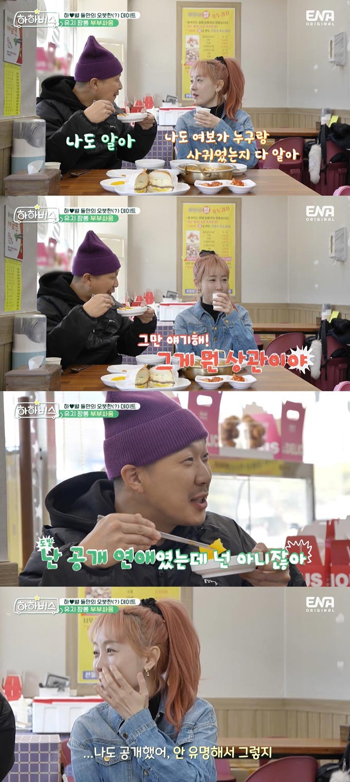그러나 하하는 아내 별의 눈치를 보더니 돌연 "난 공개 (연애)였는데 넌 아니지 않았냐"며 과거 공개 열애했던 안혜경을 언급했고, 이를 들은 별은 민망한 듯 웃으며 "나도 공개했는데 안 유명해서 그렇지"라고 자폭해 웃음을 안겼다.