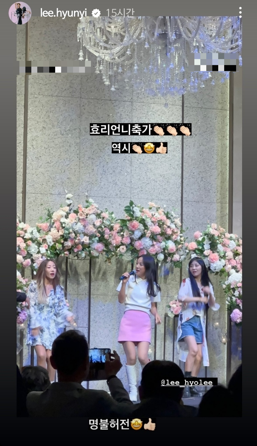 지난 29일 모델 이현이는 자신의 인스타그램 스토리에 "효리언니 축가, 역시 명불허전"이라는 글과 함께 사진 두 장을 게재했다.