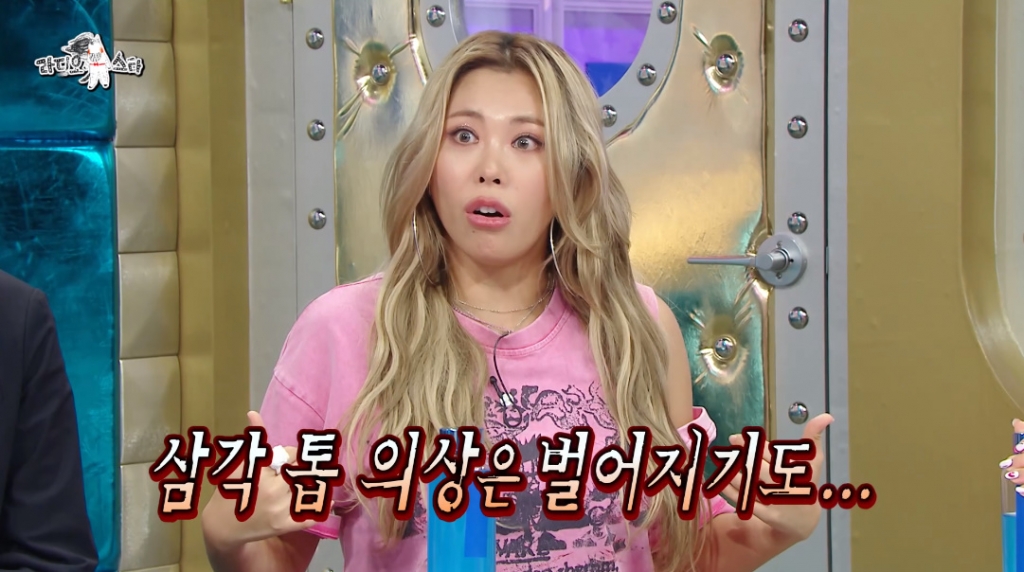 가비는 "제가 상체, 바스트(가슴) 사이즈가 큰 편이라서 옷을 입을 때 굉장히 중요하다"며 "춤추는 사람들은 (춤 출 때) 내가 얼마나 힘을 쓰는지 모른다. 가슴을 크게 쓰는 동작을 하다 보면 (의상이) 올라가거나 내려간다. 삼각 톱을 입으면 벌어지기도 한다"고 말했다.