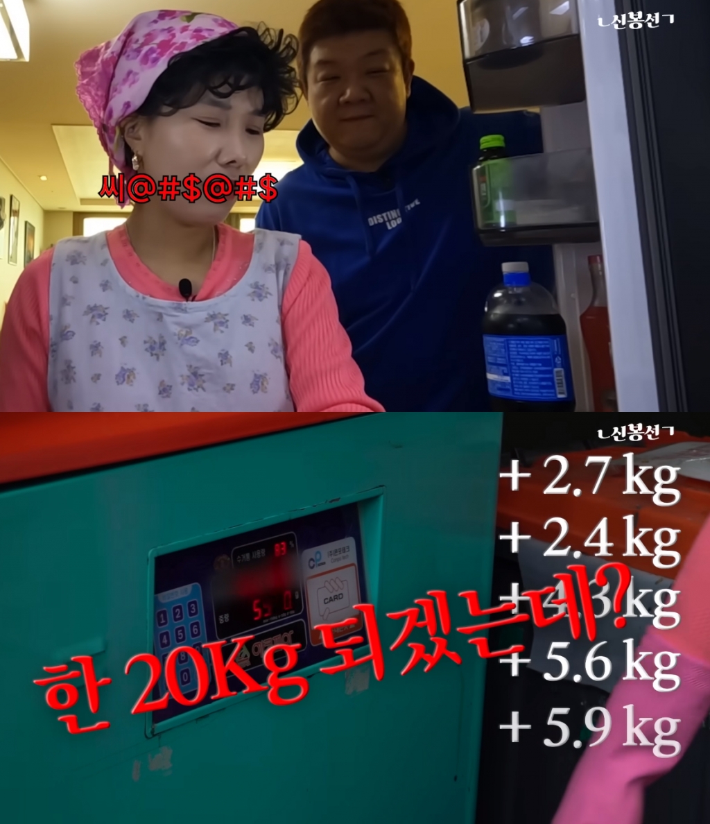 유민상은 "꽝꽝 얼려서 괜찮다" "조용히 해라 애들 깬다"라며 너스레를 떨었다. 신봉선은 썩어버린 음식으로 가득 찬 냉장고를 뒤지며 "아 씨" "아 너무 싫어" "아~ XX"이라며 연신 욕을 뱉었다.
