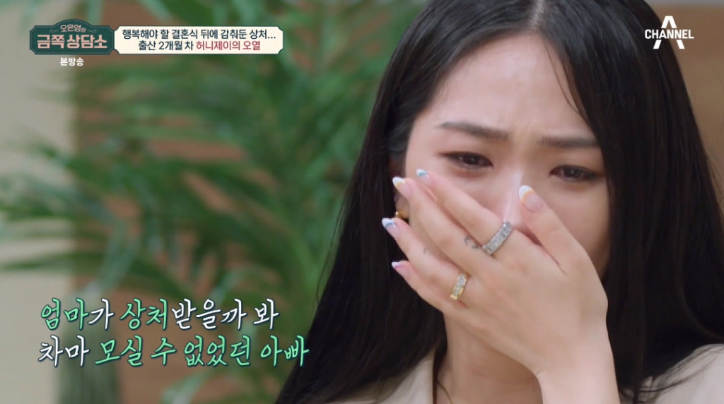 그는 "저도 아빠 손 잡고 들어가고 싶었는데 결혼식 때 엄마가 상처받을까봐 아빠를 초대하지 못했다"며 눈물을 쏟았다.