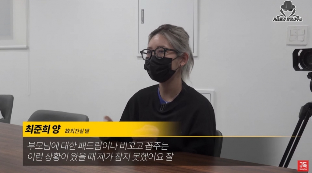 지난 14일 유튜브 채널 '카라큘라 탐정사무소'에는 최준희의 학폭 가해 논란 관련 인터뷰 영상이 게재됐다.