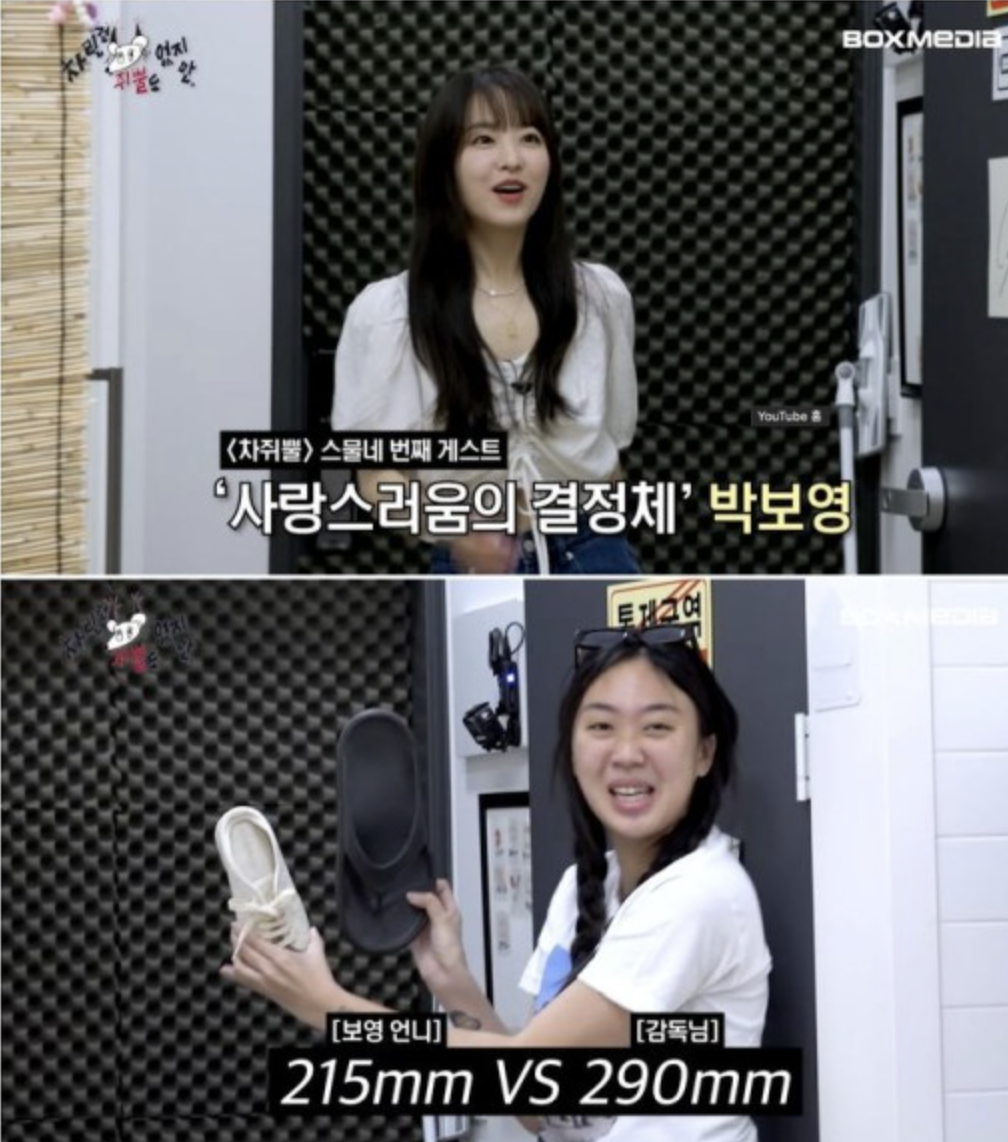 이어 이영지는 215mm인 박보영의 신발 사이즈에 또 한 번 놀랐다. 신발을 집어 들고 방송 스태프의 신발과 비교하며 너무 귀엽다는 듯한 반응을 보였다.