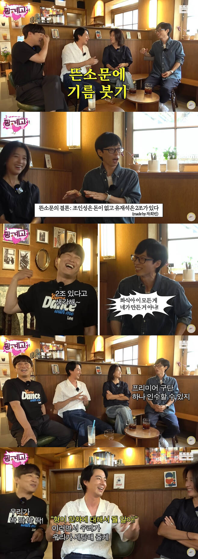 이에 차태현은 "형 2조 있으면 한화 좀 사가지고 선수 좀 다 데리고 오면 안 돼?"라고 하자 조인성도 "형이 사면 우리가 형을 조종할 수 있을 거 같다. 우리가 원하는 선수들을 데리고 올 수 있을 거 같다. '형이 한화에 대해서 뭘 알아' 하면서 우리가 세팅을 해줄게"라고 말해 웃음을 자아냈다.
