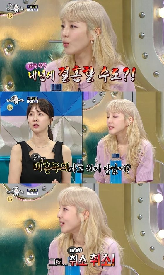 산다라박과 절친한 박소현은 "비혼주의를 굉장히 일찍 선언했더라"고 물었고 산다라박은 "선언은… 취소하겠다"고 답했다.