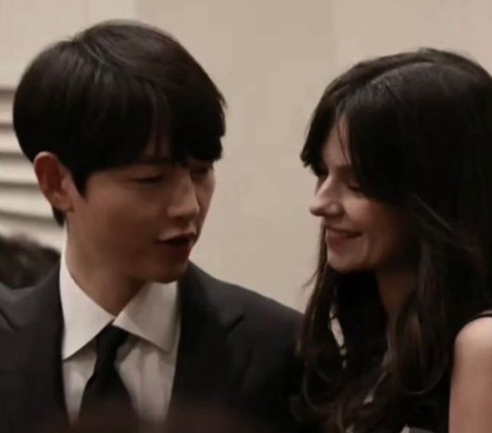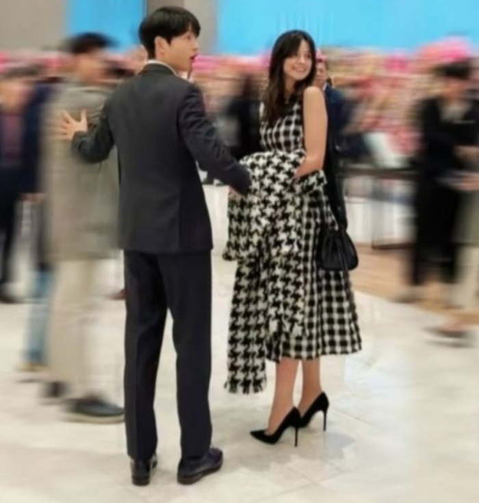 사진을 보면 송중기는 깔끔한 슈트 차림이다. 케이티는 체크 패턴의 코트와 원피스로 멋을 냈다. 둘은 손을 맞잡고 꼭 붙어 다니며 여전히 다정한 모습을 보여줬다.