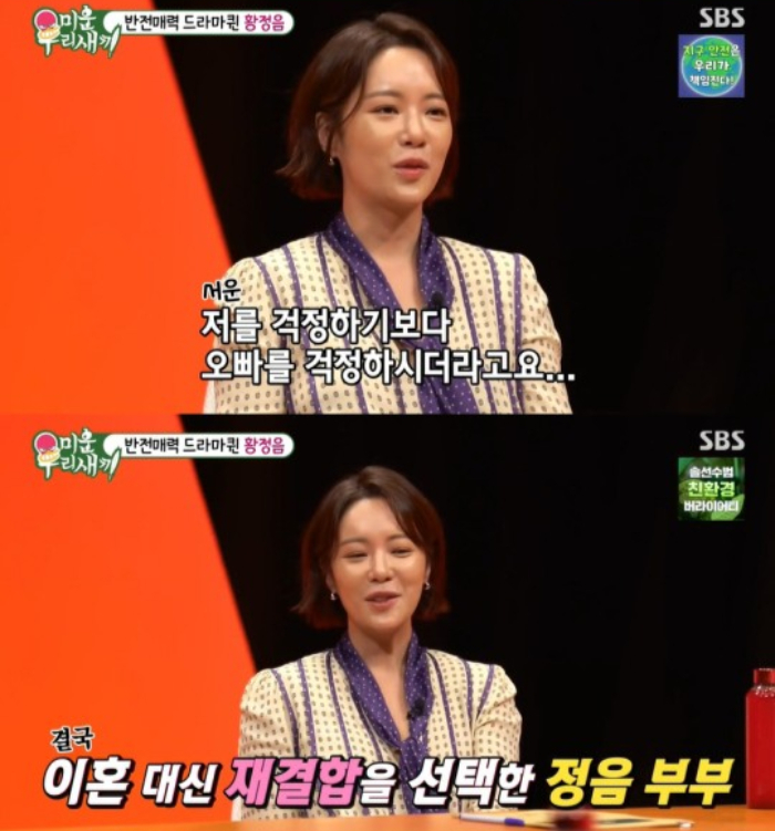 황정음은 2020년 남편과 갈등 끝에 이혼 조정 신청서를 법원에 제출하기까지 했다고 고백했다. 1년 만에 위기를 극복하고 재결합을 선택했다는 그는 "그래도 남편이 예전에 내가 싫어했던 행동을 조심해주고 나도 아무래도 아직 마음이 남아 있었으니까 둘이 다시 합친 거 같다"고 설명했다.