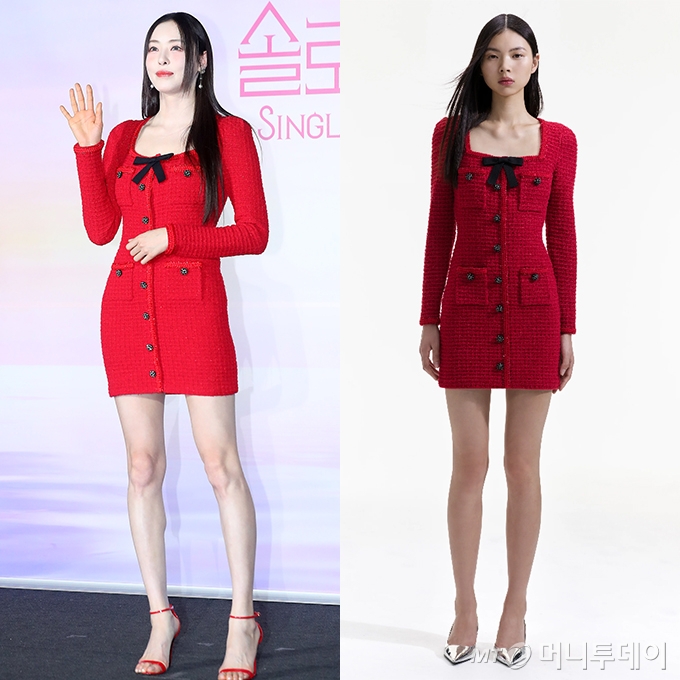 이다희는 네크라인이 넓게 파인 빨간색 트위드 원피스를 착용했다. 네크라인 중앙의 검정 리본으로 로맨틱한 분위기를 자아낸 이다희는 원피스와 같은 색상의 얇은 스트랩 샌들을 신고 쭉 뻗은 각선미를 자랑했다.