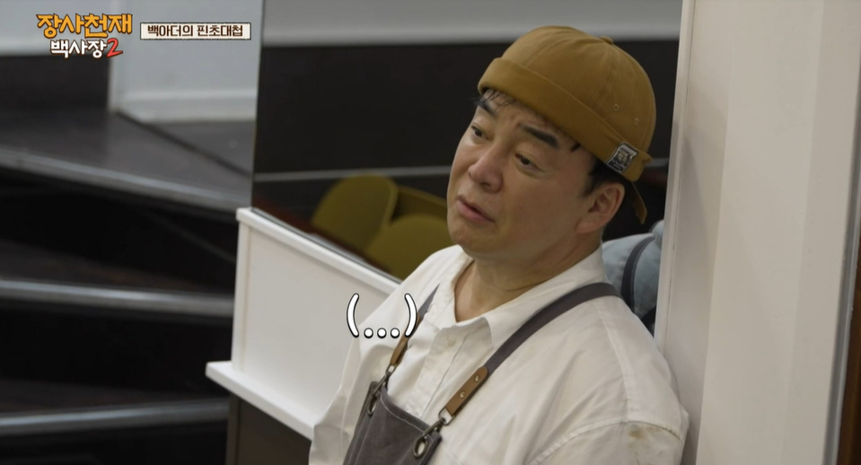 백종원은 가게 구석에서 취객의 무례함에 응대하는 꼬로의 곤란한 상황을 지켜보고 있었다.