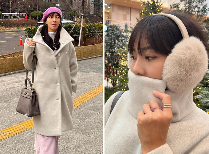 공개된 사진 속 이윤진은 티셔츠에 핑크빛 바지를 입고 화사한 코트를 걸친 모습이다. 여기에 보랏빛 니트 모자, 포근한 귀마개 등 겨울 패션소품과 럭셔리한 명품 가방, 주얼리로 멋을 냈다.