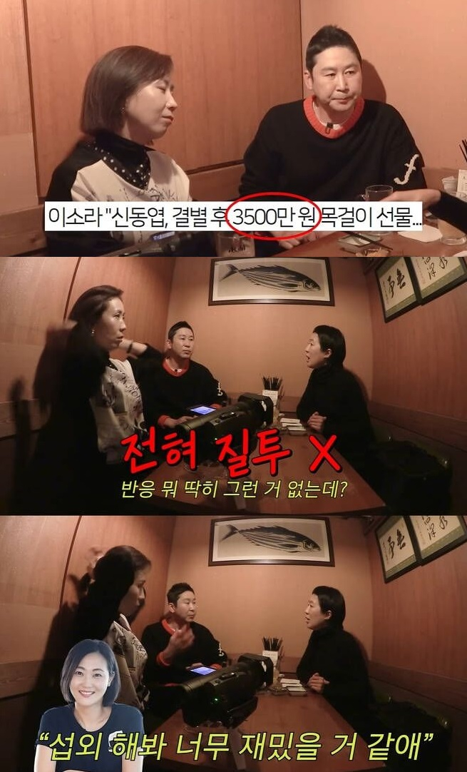 홍진경은 최근 한 유튜브 영상에서 신동엽과 이소라가 재회한 것을 언급했다. 홍진경은 "동엽 오빠와 소라 언니가 만났더라"며 "그 영상에서 오빠가 헤어진 뒤 명품 목걸이를 소라 언니에게 선물했다고 말하지 않았느냐"고 했다.