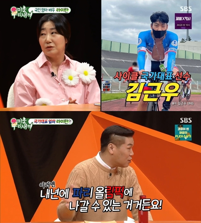 이날 MC 서장훈은 "라미란의 자랑이 따로 있다. 바로 아들이다. 라미란의 아들이 능력자다. 사이클 주니어 국가대표다"라며 김근우 선수를 언급했다. 라미란은 "이번에 국가대표 돼서 오늘 (선수촌에) 들어갔다"라고 말했다.